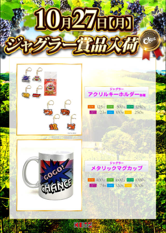 10月27日(月)ジャグラー アクリルキーホルダー・メタリックマグカップ【KEIZ LAPARK金沢店】 └オリジナル景品 10月27日(月)ジャグラー アクリルキーホルダー・メタリックマグカップ【KEIZ LAPARK金沢店】 └オリジナル景品 2025.10.27 KEIZ LAPARK金沢店 石川県金沢市西泉4-11 詳しく見る