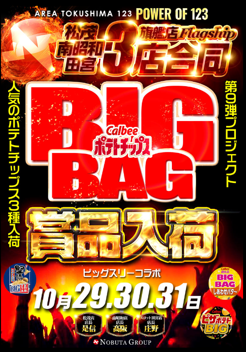 10月29日(水)ポテトチップス しあわせバタ~BIG BAG・ピザポテトBIG・堅あげポテト うすしお味BIG【スロット123田宮店】 └オリジナル景品 2025.10.29 スロット123田宮店 徳島県徳島市南田宮3-1-8 詳しく見る 徳島市