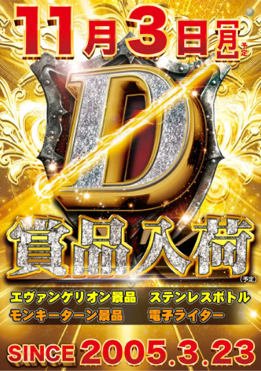 11月3日(月)エヴァンゲリオン ステンレスボトル・モンキーターン 電子ライター【ダイナム高知土佐店】 └オリジナル景品 11月3日(月)エヴァンゲリオン ステンレスボトル・モンキーターン 電子ライター【ダイナム高知土佐店】 └オリジナル景品 2025.11.03 ダイナム高知土佐店 高知県土佐市高岡町字光永北ノ丁乙3343番地1 詳しく見る