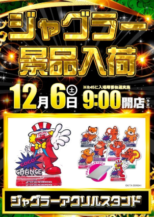 12月6日(土)ジャグラーアクリルスタンド【ダイナム愛知名古屋稲永店 ゆったり館】 └オリジナル景品 2025.12.06 ダイナム愛知名古屋稲永店 ゆったり館 愛知県名古屋市港区稲永二丁目13番43号 詳しく見る 名古屋市港区