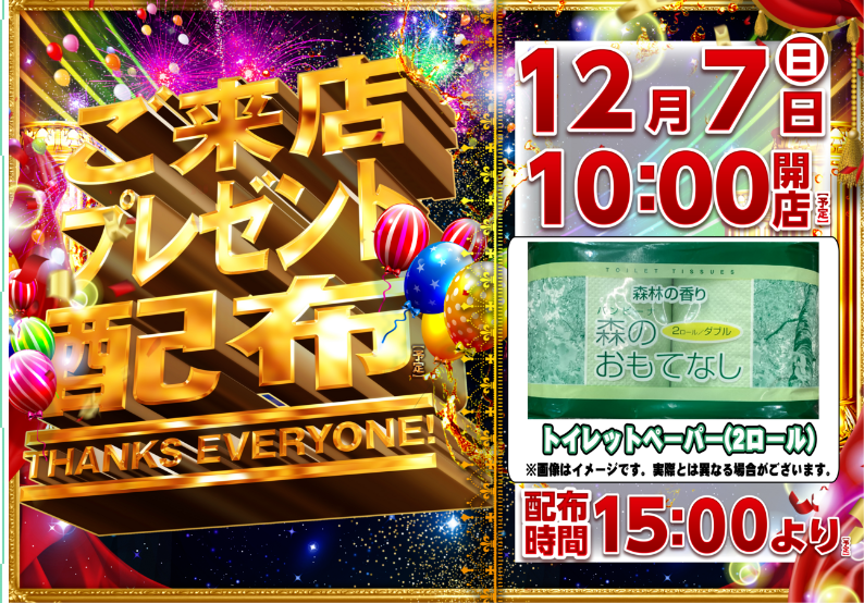 12月7日(日)トイレットペーパー 2ロール【ダイナム石川加賀店 ゆったり館】 └オリジナル景品 2025.12.07 ダイナム石川加賀店 ゆったり館 石川県加賀市上河崎町50番地1 詳しく見る 加賀市