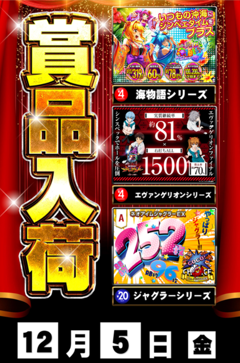 12月5日(金)海物語シリーズ・エヴァンゲリオンシリーズ・ジャグラーシリーズ【100万ドルアムアム店】 └オリジナル景品 12月5日(金)海物語シリーズ・エヴァンゲリオンシリーズ・ジャグラーシリーズ【100万ドルアムアム店】 └オリジナル景品 2025.12.05 100万ドルアムアム店 長野県佐久市長土呂新城125-1 詳しく見る