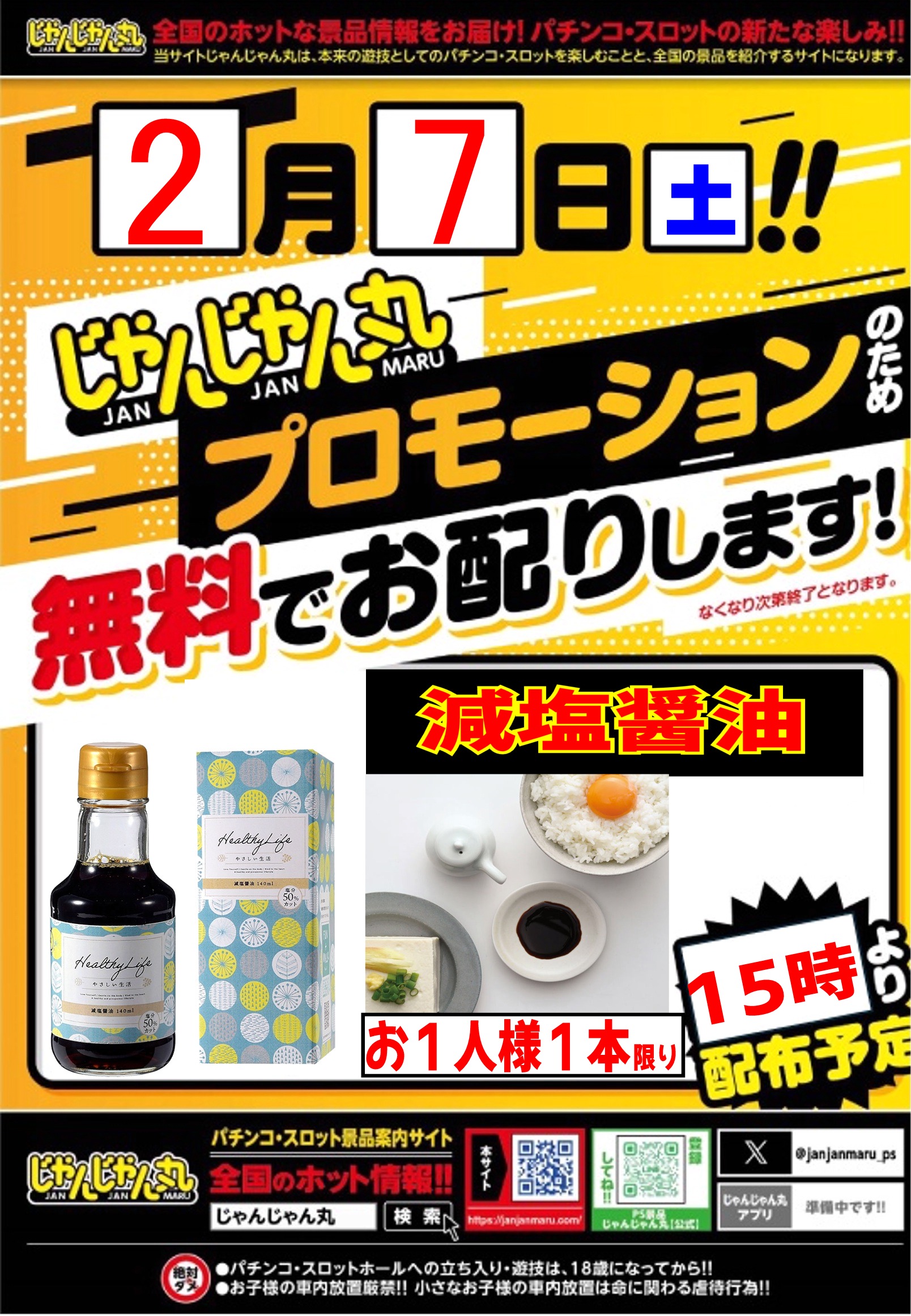 2月7日(土)【じゃんじゃん丸プロモーション】減塩醤油の配布!ニューダイヤ塩山店にて! └オリジナル景品 2月7日(土)【じゃんじゃん丸プロモーション】減塩醤油の配布!ニューダイヤ塩山店にて! └オリジナル景品 2026.02.07 ニューダイヤ塩山店 山梨県甲州市塩山下塩後538-1 詳しく見る
