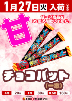 1月27日(火)チョコバット【深井アロー】 └オリジナル景品 1月27日(火)チョコバット【深井アロー】 └オリジナル景品 2026.01.27 深井アロー 大阪府堺市中区深井沢町2458-9 詳しく見る