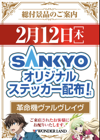 2月12日(木)総付景品 SANKYOオリジナルステッカー【ワンダーランド1177大分南店】 └オリジナル景品 2月12日(木)総付景品 SANKYOオリジナルステッカー【ワンダーランド1177大分南店】 └オリジナル景品 2026.02.12 ワンダーランド1177大分南店 大分県大分市畑中2丁目7番7号 詳しく見る