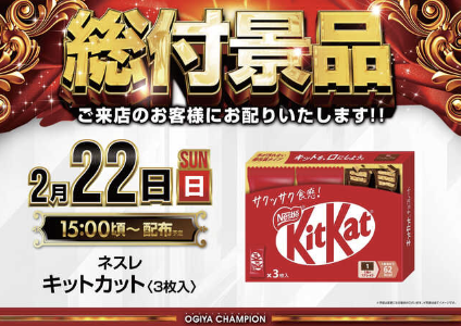 2月22日(日)総付景品 キットカット3枚入【オーギヤチャンピオン】 └オリジナル景品 2月22日(日)総付景品 キットカット3枚入【オーギヤチャンピオン】 └オリジナル景品 2026.02.22 オーギヤチャンピオン 愛知県豊橋市曙町字南松原126-2 詳しく見る