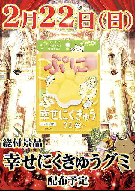 2月22日(日)総付景品 幸せにくきゅうグミ【リブレ-遊援館】 └オリジナル景品 2月22日(日)総付景品 幸せにくきゅうグミ【リブレ-遊援館】 └オリジナル景品 2026.02.22 リブレ-遊援館 愛知県豊田市元宮町2丁目11番リブレ1階 詳しく見る