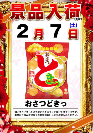 2月8日(日)だだちゃ豆・ポテトチップス【ダイナム長野茅野店 ゆったり館】 └オリジナル景品 2月8日(日)だだちゃ豆・ポテトチップス【ダイナム長野茅野店 ゆったり館】 └オリジナル景品 2026.02.08 ダイナム長野茅野店 ゆったり館 長野県茅野市宮川字姫宮1375番地1 詳しく見る