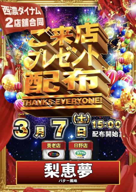 3月8日(日)ご来店プレゼント ビスキュイワッフル【ダイナムゆったり館 岐阜桐生店】 └オリジナル景品 2026.03.08 ダイナムゆったり館 岐阜桐生店 岐阜県高山市桐生町6丁目51 詳しく見る 高山市