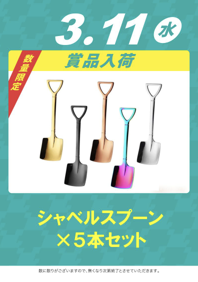 3月11日(水)シャベルスプーン 5本セット【QUICK7大須店】【QUICK7大須店】 └オリジナル景品 2026.03.11 QUICK7大須店 愛知県名古屋市中区大須3-31-11 詳しく見る 名古屋市中区