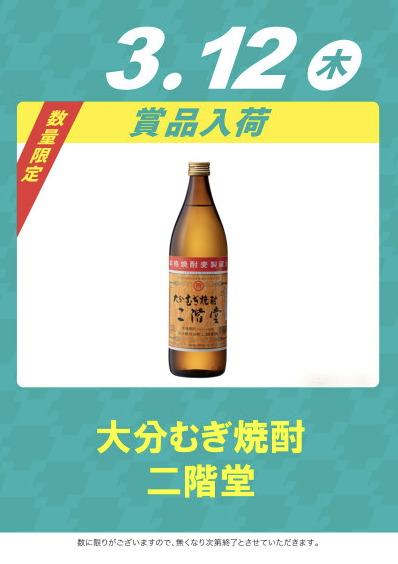 3月12日(木)大分むぎ焼酎 二階堂【QUICK7大須店】 └オリジナル景品 3月12日(木)大分むぎ焼酎 二階堂【QUICK7大須店】 └オリジナル景品 2026.03.12 QUICK7大須店 愛知県名古屋市中区大須3-31-11 詳しく見る