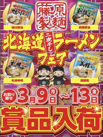 3月9日(月)〜13日(金)藤原製麺 北海道二夜干しラーメンフェア【プリンス】 └オリジナル景品 3月9日(月)〜13日(金)藤原製麺 北海道二夜干しラーメンフェア【プリンス】 └オリジナル景品 2026.03.13 プリンス 愛知県岡崎市井田南町7-7 詳しく見る