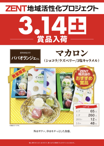 3月14日(土)マカロン【ZENT岡崎インター店】 └オリジナル景品 3月14日(土)マカロン【ZENT岡崎インター店】 └オリジナル景品 2026.03.14 ZENT岡崎インター店 愛知県岡崎市大平町字堤上1 詳しく見る