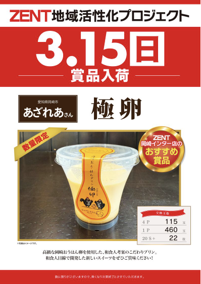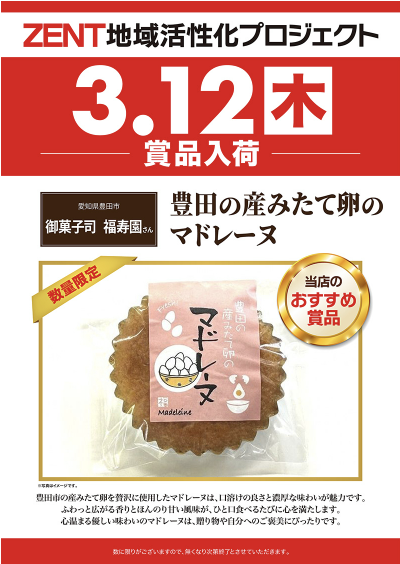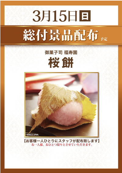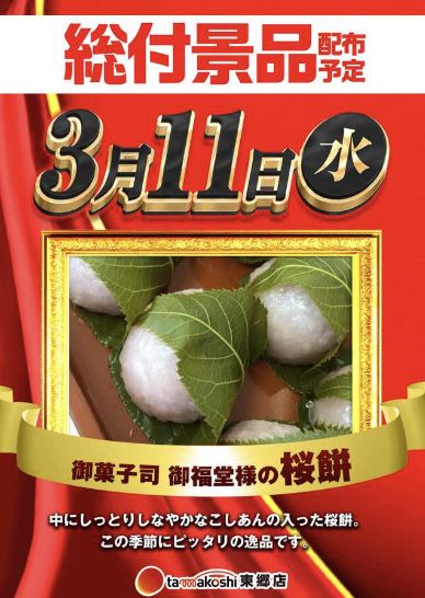 3月15日(日)総付景品 桜餅【ZENT豊田本店】 └オリジナル景品 3月15日(日)総付景品 桜餅【ZENT豊田本店】 └オリジナル景品 2026.03.15 ZENT豊田本店 愛知県豊田市若林西町北長根13番地12 詳しく見る