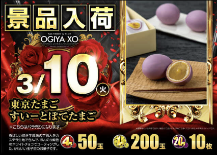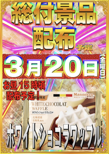 3月20日(金)総付景品 ホワイトショコラワッフル【チャンピオンタイキ蒲郡店】 └オリジナル景品 3月20日(金)総付景品 ホワイトショコラワッフル【チャンピオンタイキ蒲郡店】 └オリジナル景品 2026.03.20 チャンピオンタイキ蒲郡店 愛知県蒲郡市竹谷町西ノ浜35-12 詳しく見る