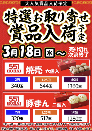 3月26日(木)551蓬莱 豚まん【KB SUPER STADIUM 勝浦店】 └オリジナル景品 3月26日(木)551蓬莱 豚まん【KB SUPER STADIUM 勝浦店】 └オリジナル景品 2026.03.26 KB SUPER STADIUM 勝浦店 和歌山県東牟婁郡那智勝浦町湯川897-184 詳しく見る