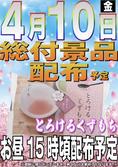 4月10日(金)総付景品 とろけるくずもち【チャンピオンタイキ蒲郡店】 └オリジナル景品 4月10日(金)総付景品 とろけるくずもち【チャンピオンタイキ蒲郡店】 └オリジナル景品 2026.04.10 チャンピオンタイキ蒲郡店 愛知県蒲郡市竹谷町西ノ浜35-12 詳しく見る