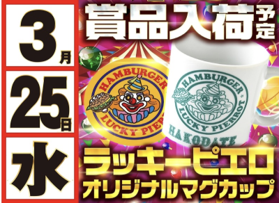 3月25日(水)ラッキーピエロ オリジナルマグカップ【ラッキー1BAN日進竹の山店】 └オリジナル景品 2026.03.25 ラッキー1BAN日進竹の山店 知県日進市竹の山1-1605 詳しく見る 日進市