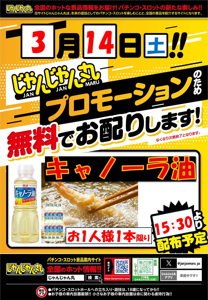 3月14日(土)【じゃんじゃん丸プロモーション】キャノーラ油の配布!ニューダイヤ山梨店にて! └オリジナル景品 3月14日(土)【じゃんじゃん丸プロモーション】キャノーラ油の配布!ニューダイヤ山梨店にて! └オリジナル景品 2026.03.14 ニューダイヤ山梨店 山梨県山梨市南1183 詳しく見る