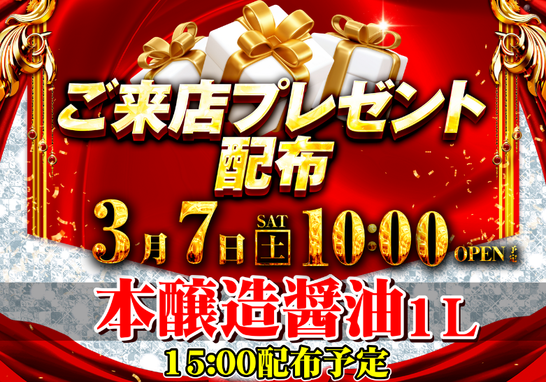 3月7日(土)本醸造醤油1L【ダイナム長野飯山店】 └オリジナル景品 3月7日(土)本醸造醤油1L【ダイナム長野飯山店】 └オリジナル景品 2026.03.07 ダイナム長野飯山店 長野県飯山市大字静間字郷谷1418番地2 詳しく見る