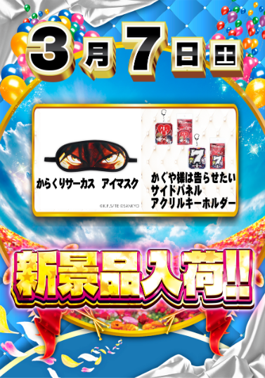 3月7日(土)からくりサーカス アイマスク・かぐや様は告らせたい サイドパネル・アクリルキーホルダー【ダイナム石川福久店 ゆったり館】 └オリジナル景品 3月7日(土)からくりサーカス アイマスク・かぐや様は告らせたい サイドパネル・アクリルキーホルダー【ダイナム石川福久店 ゆったり館】 └オリジナル景品 2026.03.07 ダイナム石川福久店 ゆったり館 石川県金沢市南森本町ホ121番地3 詳しく見る