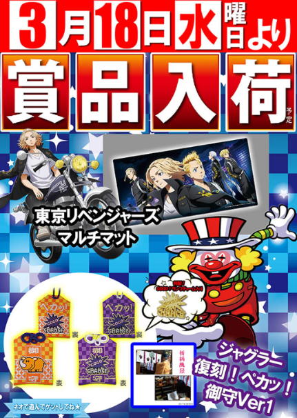 3月18日(水)東京リベンジャーズ マルチマット・ジャグラー 復刻!ペカッ!御守Ver.【タイヨーネオ富山店】 └オリジナル景品 2026.03.18 タイヨーネオ富山店 富山県富山市新庄本町1丁目79-1 詳しく見る 富山市
