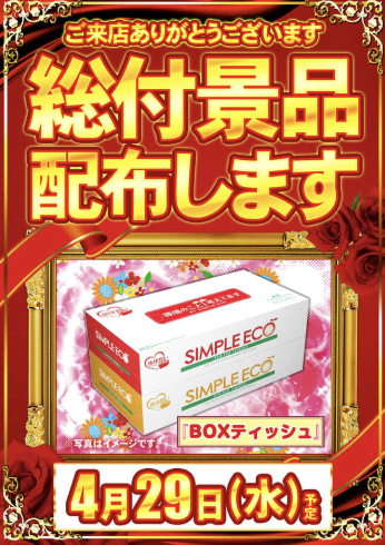 4月29日(水)総付景品 BOXティッシュ【MORiNAGA第一南栄店】 └オリジナル景品 4月29日(水)総付景品 BOXティッシュ【MORiNAGA第一南栄店】 └オリジナル景品 2026.04.29 MORiNAGA第二南栄店 鹿児島県鹿児島市南栄5丁目10番38号 詳しく見る