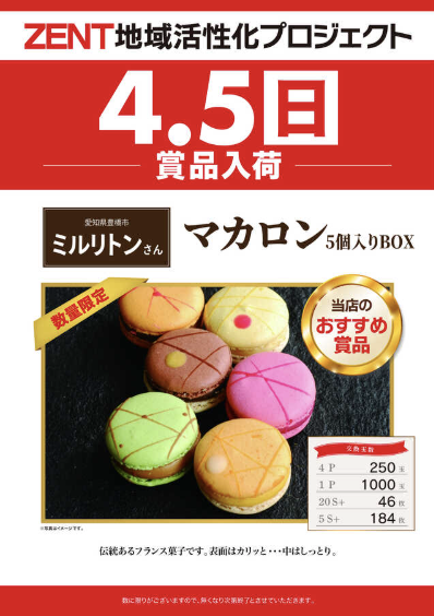 4月5日(日)マカロン 5個入りBOX【ZENT豊橋藤沢店】 └オリジナル景品 2026.04.05 ZENT豊橋藤沢店 愛知県豊橋市藤沢町141-11(MEGAドン・キホーテ豊橋店内) 詳しく見る 豊橋市