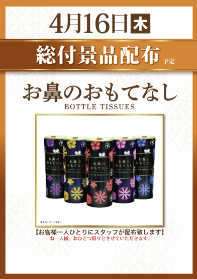 4月16日(木)総付景品 お鼻のおもてなし【ZENT若林店】 └オリジナル景品 4月16日(木)総付景品 お鼻のおもてなし【ZENT若林店】 └オリジナル景品 2026.04.16 ZENT若林店 愛知県豊田市若林東町雁股5-1 詳しく見る