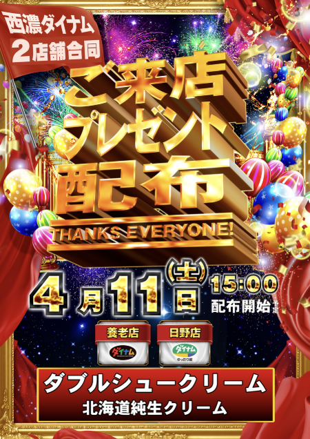 4月11日(土)ご来店プレゼント ダブルシュークリーム北海道純正クリーム【ダイナム岐阜養老店】 └オリジナル景品 2026.04.11 ダイナム岐阜養老店 岐阜県養老郡養老町宇田字郷勺594番地1 詳しく見る 養老郡養老町