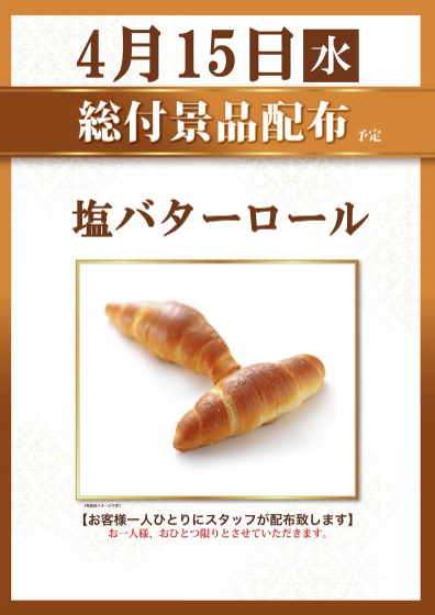 4月15日(水)総付景品 塩バターロール【ZENT豊橋藤沢店】 └オリジナル景品 2026.04.15 ZENT豊橋藤沢店 愛知県豊橋市藤沢町141-11(MEGAドン・キホーテ豊橋店内) 詳しく見る 豊橋市