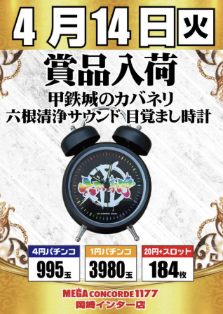 4月14日(火)甲鉄城のカバネリ 六根清浄サウンド目覚まし時計【MEGAコンコルド1177岡崎インター店】 └オリジナル景品 2026.04.14 MEGAコンコルド1177岡崎インター店 愛知県岡崎市欠町野添14-1 詳しく見る 岡崎市