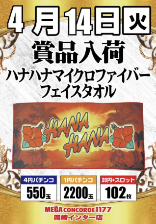 4月14日(火)ハナハナマイクロファイバーフェイスタオル【MEGAコンコルド1177岡崎インター店】 └オリジナル景品 2026.04.14 MEGAコンコルド1177岡崎インター店 愛知県岡崎市欠町野添14-1 詳しく見る 岡崎市