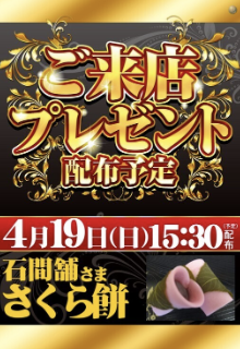 4月19日(日)ご来店プレゼント さくら餅【ダイナム榛原店 ゆったり館】 └オリジナル景品 2026.04.19 ダイナム榛原店 ゆったり館 静岡県牧之原市細江字十石2449番地1 詳しく見る 牧之原市
