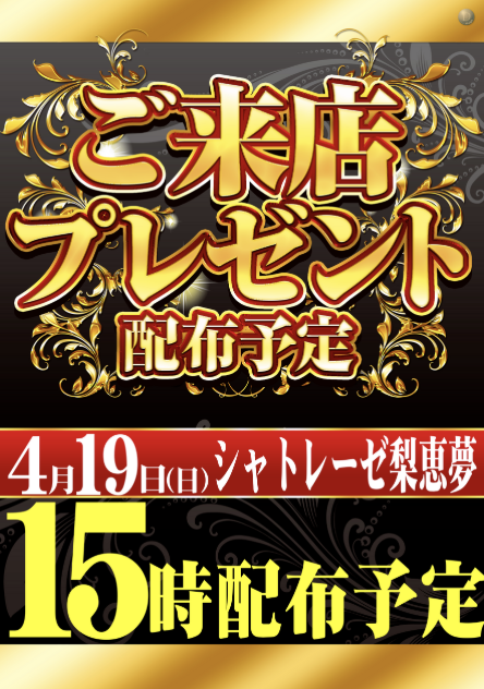 4月19日(日)ご来店プレゼント シャトレーゼ梨恵夢【ダイナム大阪貝塚店 ゆったり館】 └オリジナル景品 2026.04.19 ダイナム大阪貝塚店 ゆったり館 大阪府貝塚市澤931番地2 詳しく見る 貝塚市