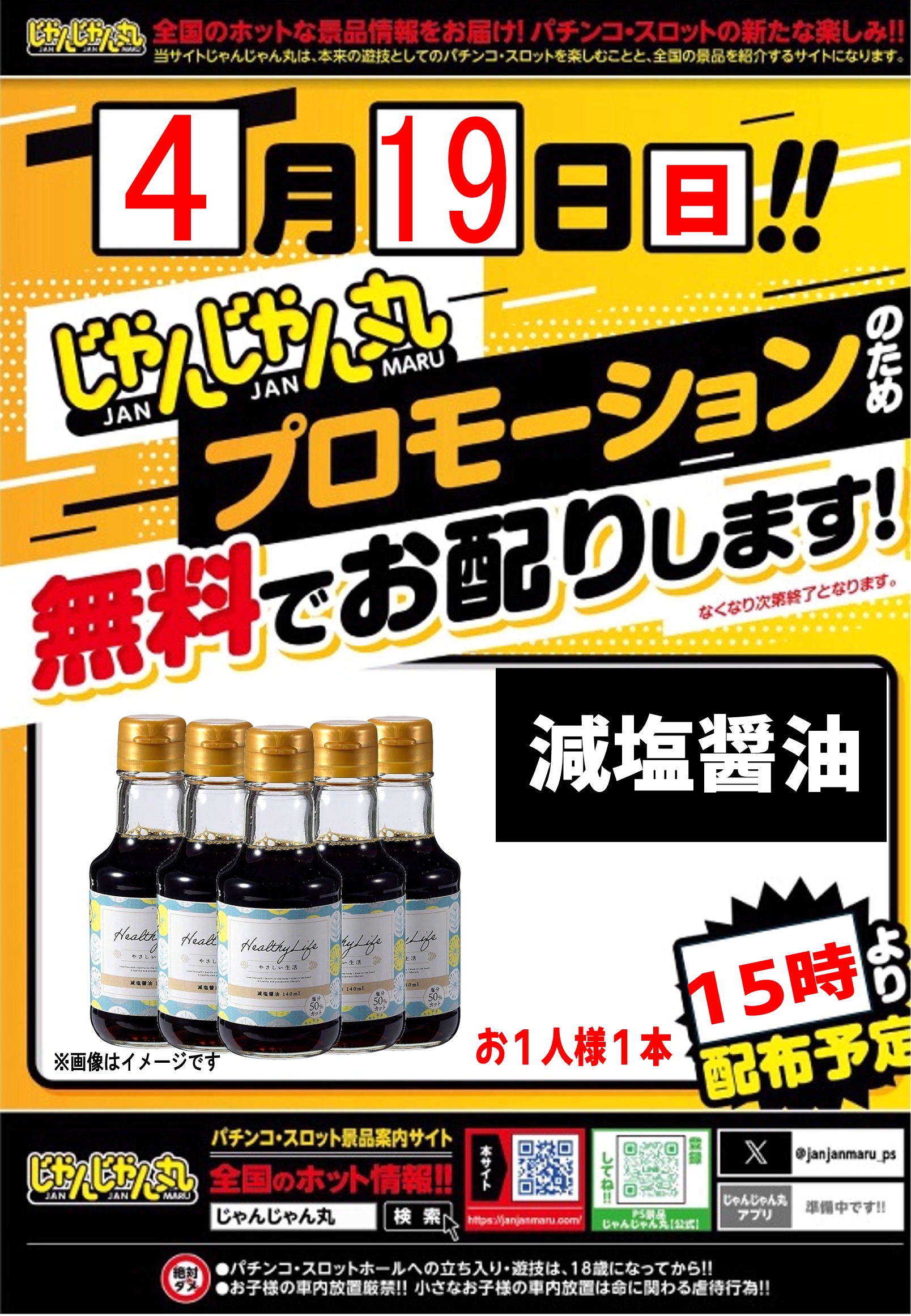 4月19日(日)【じゃんじゃん丸プロモーション】減塩醤油の配布!ニューダイヤ塩山店にて! └オリジナル景品 4月19日(日)【じゃんじゃん丸プロモーション】減塩醤油の配布!ニューダイヤ塩山店にて! └オリジナル景品 2026.04.19 ニューダイヤ塩山店 山梨県甲州市塩山下塩後538-1 詳しく見る