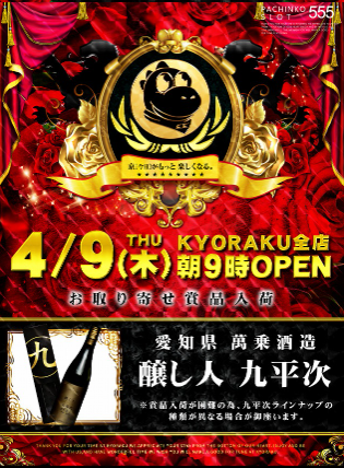 4月9日(木)醸し人 九平次【KYORAKU西店】 └オリジナル景品 4月9日(木)醸し人 九平次【KYORAKU西店】 └オリジナル景品 2026.04.09 KYORAKU西店 愛知県名古屋市西区浄心本通3-8 詳しく見る