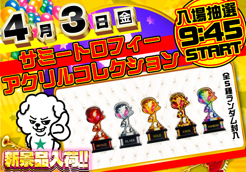 4月3日(金)サミートロフィーアクリルコレクション【ダイナム石川加賀店 ゆったり館】 └オリジナル景品 2026.04.03 ダイナム石川加賀店 ゆったり館 石川県加賀市上河崎町50番地1 詳しく見る 加賀市