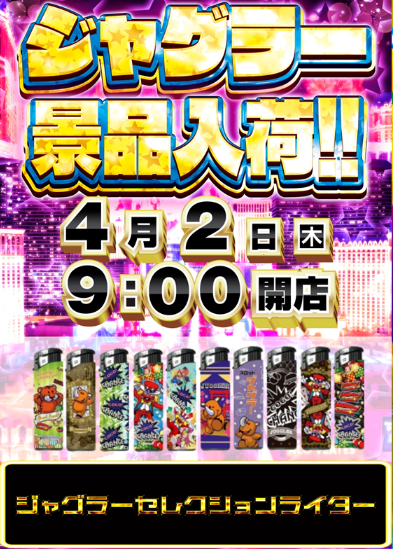 4月2日(木)ジャグラーセレクションライター【ダイナム富山高岡波岡店 ゆったり館】 └オリジナル景品 4月2日(木)ジャグラーセレクションライター【ダイナム富山高岡波岡店 ゆったり館】 └オリジナル景品 2026.04.02 ダイナム富山高岡波岡店 ゆったり館 富山県高岡市波岡323番地1 詳しく見る