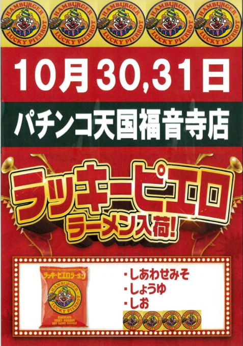 10月30日(木)ラッキーピエロラーメン しあわせみそ・しょうゆ・しお【パチンコ天国福音寺店】 └オリジナル景品 2025.10.30 パチンコ天国福音寺店 愛媛県松山市福音寺町251-1 詳しく見る 松山市