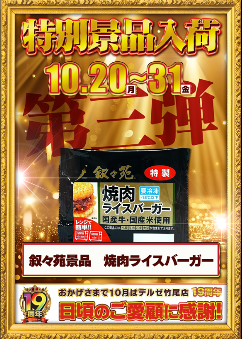 10月20日(月)叙々苑 焼肉ライスバーガー【デルゼビッグサイト新潟竹尾店】 └オリジナル景品 2025.10.20 デルゼビッグサイト新潟竹尾店 新潟県新潟市東区竹尾626-1 詳しく見る 新潟市東区
