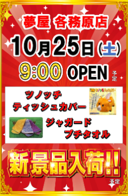 10月25日(土)ツノッチティッシュカバー・ジャガードプチタオル【夢屋各務原店】 └オリジナル景品 10月25日(土)ツノッチティッシュカバー・ジャガードプチタオル【夢屋各務原店】 └オリジナル景品 2025.10.25 夢屋各務原店 岐阜県各務原市蘇原花園町2-72 詳しく見る
