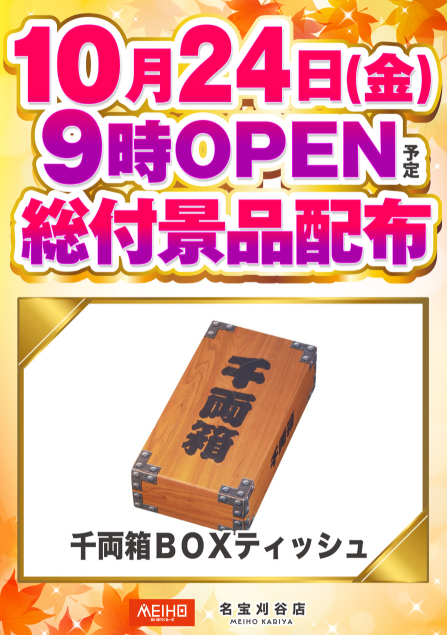 10月24日(金)千両箱BOXティッシュ【名宝刈谷店】 └オリジナル景品 10月24日(金)千両箱BOXティッシュ【名宝刈谷店】 └オリジナル景品 2025.10.24 名宝刈谷店 愛知県刈谷市神明町3-403 詳しく見る