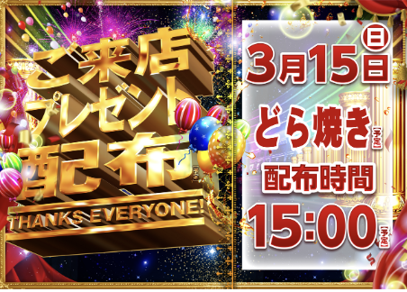 3月15日(日)ご来店プレゼント どら焼き【ダイナム鹿児島東串良店 ゆったり館】 └オリジナル景品 3月15日(日)ご来店プレゼント どら焼き【ダイナム鹿児島東串良店 ゆったり館】 └オリジナル景品 2026.03.15 ダイナム鹿児島東串良店 ゆったり館 鹿児島県肝属郡東串良町池之原字境2589番地1 詳しく見る