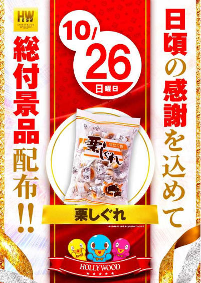 10月26日(日)栗しぐれ【スーパーハリウッド倉敷店】 └オリジナル景品 10月26日(日)栗しぐれ【スーパーハリウッド倉敷店】 └オリジナル景品 2025.10.26 スーパーハリウッド倉敷店 岡山県倉敷市松島1173-1 詳しく見る