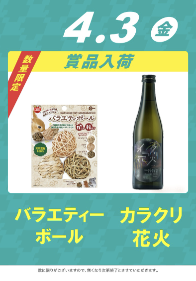 4月3日(金)バラエティーボール・カラクリ花火【QUICK7大須店】 └オリジナル景品 4月3日(金)バラエティーボール・カラクリ花火【QUICK7大須店】 └オリジナル景品 2026.04.03 QUICK7大須店 愛知県名古屋市中区大須3-31-11 詳しく見る