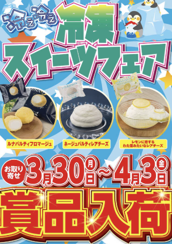 3月30日(月)〜4月3日(金)冷凍スイーツフェア【プリンス800】 └オリジナル景品 3月30日(月)〜4月3日(金)冷凍スイーツフェア【プリンス800】 └オリジナル景品 2026.04.03 プリンス800 愛知県岡崎市橋目町御小屋西28 詳しく見る