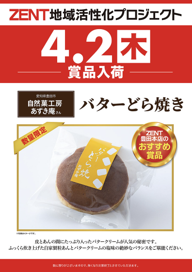 4月2日(木)バターどら焼き【ZENT若林店】 └オリジナル景品 4月2日(木)バターどら焼き【ZENT若林店】 └オリジナル景品 2026.04.02 ZENT若林店 愛知県豊田市若林東町雁股5-1 詳しく見る