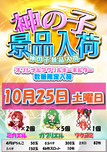 10月25日(土)神の子 オリジナルアクリルキーホルダー【クァトロブーム鹿島】 └オリジナル景品 10月25日(土)神の子 オリジナルアクリルキーホルダー【クァトロブーム鹿島】 └オリジナル景品 2025.10.25 クァトロブーム鹿島 石川県鹿島郡中能登町井田と1-1 詳しく見る