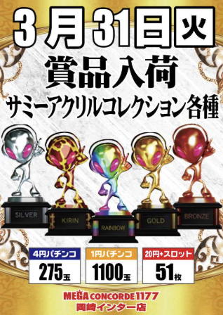 3月31日(火)サミーアクリルコレクション各種【MEGAコンコルド1177岡崎インター店】 └オリジナル景品 3月31日(火)サミーアクリルコレクション各種【MEGAコンコルド1177岡崎インター店】 └オリジナル景品 2026.03.31 MEGAコンコルド1177岡崎インター店 愛知県岡崎市欠町野添14-1 詳しく見る